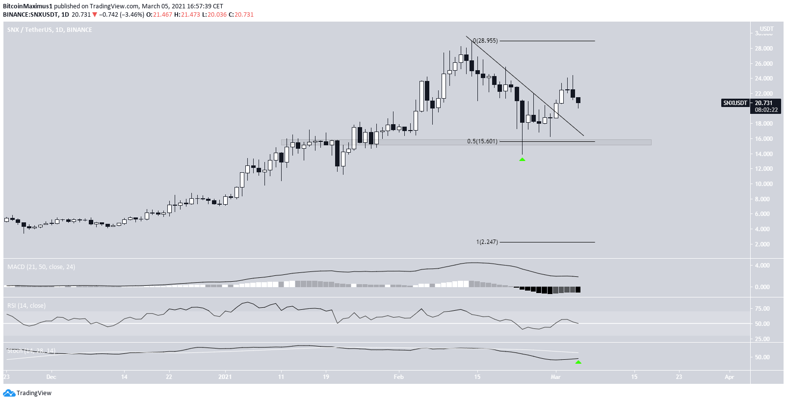 On Feb. 14, SNX reached an all-time high price of $28.98 but began to decrease afterwards, following a descending resistance line in the process.Â