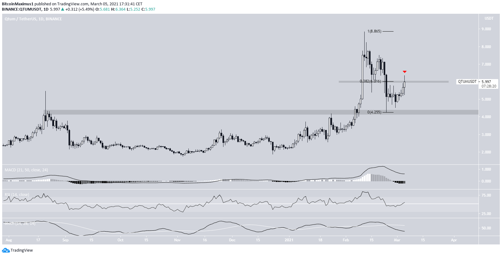 Despite the bounce, QTUM has been rejected by the minor resistance of $6. This is the 0.382 Fib retracement of the most recent downward move.