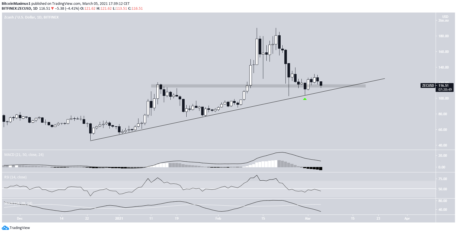 The drop has taken ZEC all the way to the $115 support area, which previously acted as resistance. The area coincides with an ascending support line that has been in place since Dec. 15, 2020.Â