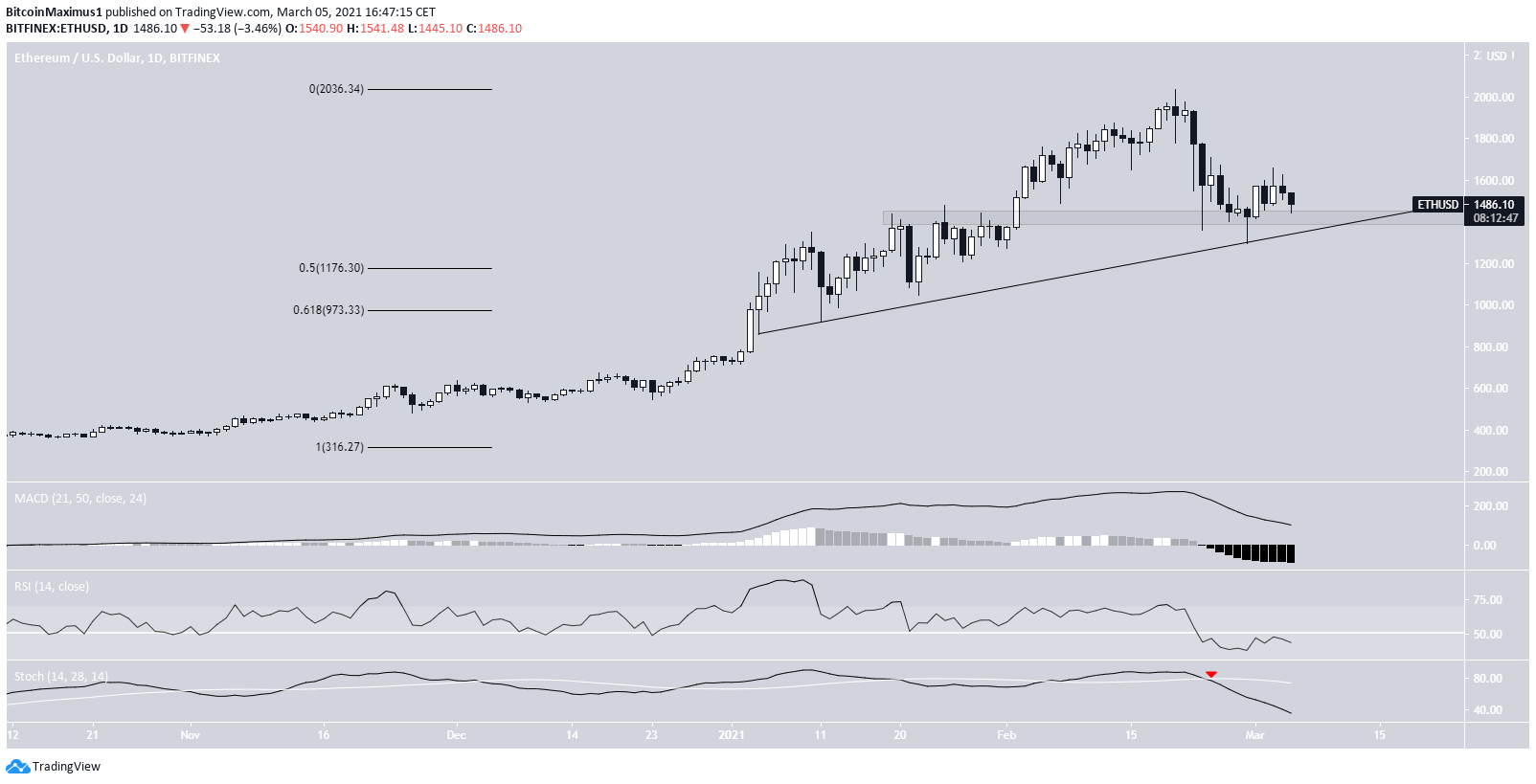 Currently, ETH is trading just above the $1430 support area, which also coincides with a long-term ascending support line. As long as ETH is trading above these levels, the price action remains bullish.Â