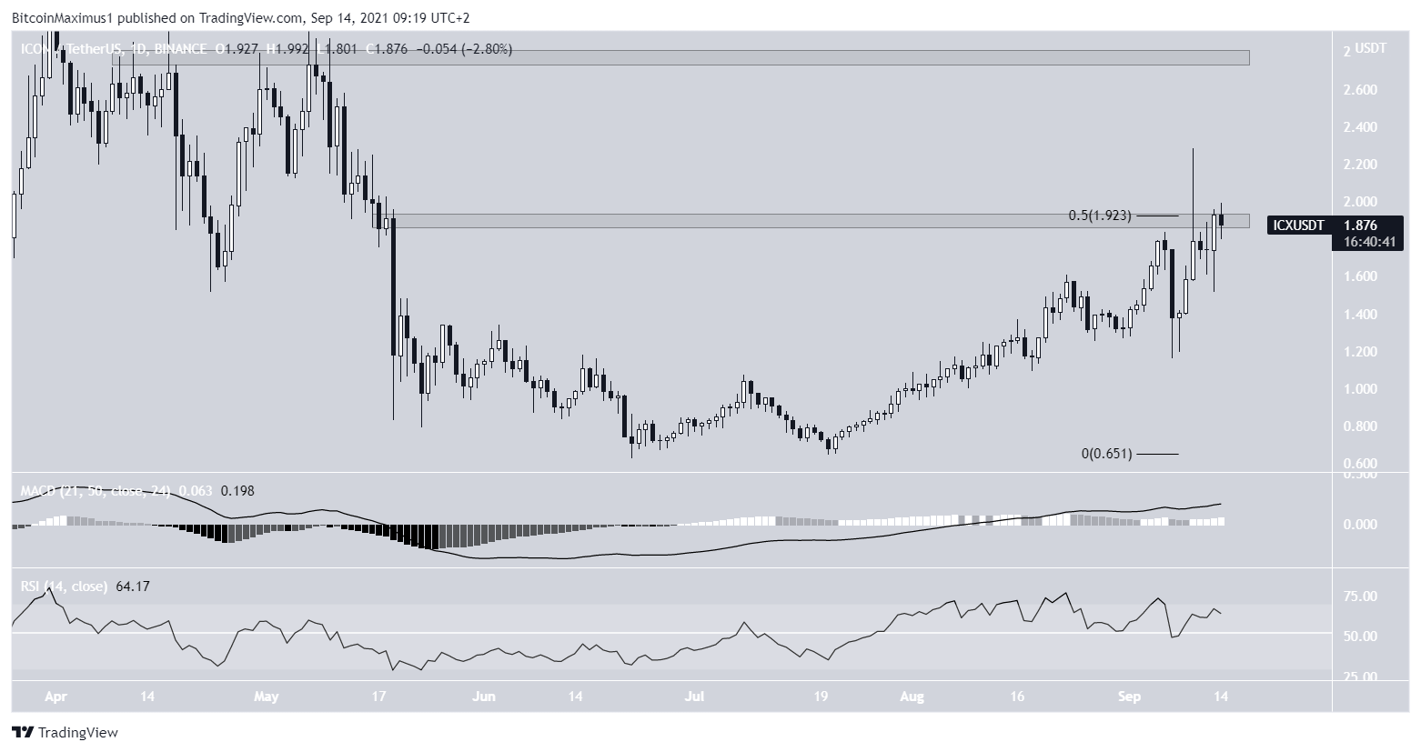 Both the MACD and RSI are increasing, supporting the possibility that ICX will move above this resistance area. If it does, the next resistance level would be found at $2.70.