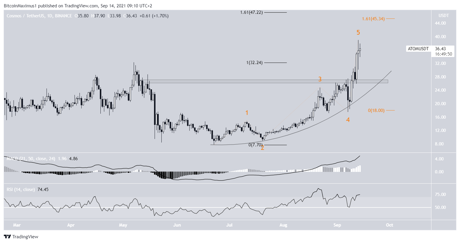 It seems that ATOM is in wave five of a bullish impulse, with a potential target for the top of the move between $45.34 and $47.22. The target range is found using the 1.61 external Fib retracement level (black) and the 1.61 length of waves 1-3 (orange).