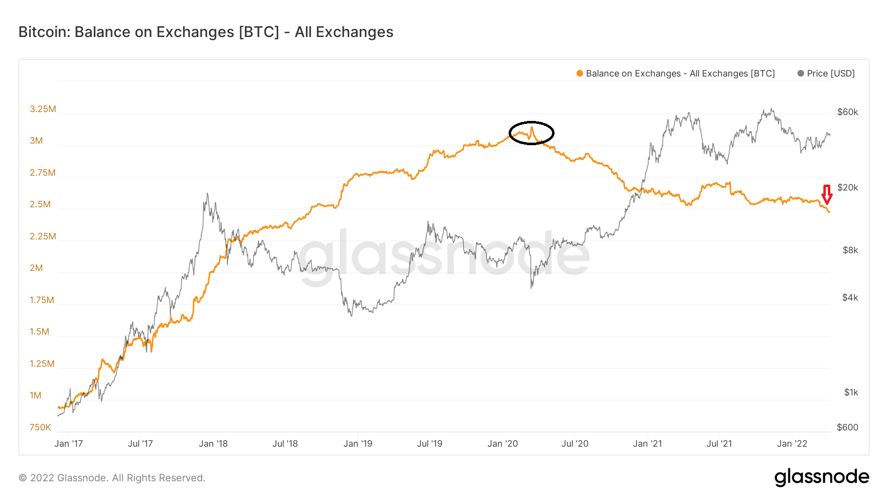 BTC held on exchange wallets has been falling since March 2020 (black circle), when a total of 3,118,057 coins were held in exchange addresses. This value still stands at an all-time high.