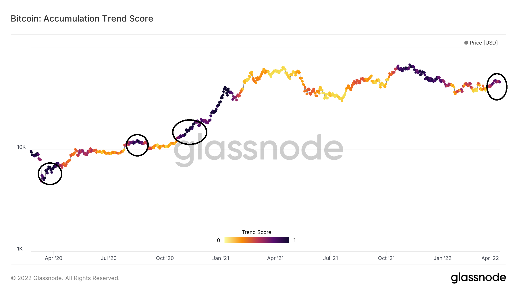 With the exception of the period between Oct 2021 and Jan 2022, such values have been seen prior to significant upwards price swings (black circles). It remains to be seen if the same will occur this time around.