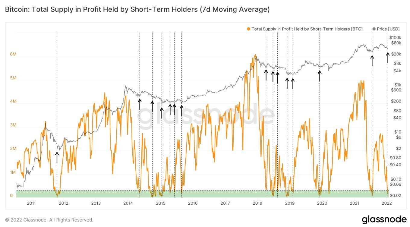 Another Twitter user, @SwellCycle posted a long-term chart of the 7-day average of STH supply in profit for the entire history of on-chain data for Bitcoin. On the chart, he highlighted the price of BTC at times when STH supply in profit reached near zero values (black arrows).