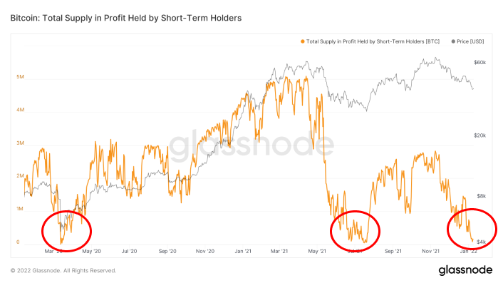 Looking at the total supply in profit for STH over the last two years, we see only 3 periods where it approached 0 (red circles). The first was the cryptocurrency market crash triggered by the COVID-19 pandemic in March 2020. The price of BTC then reached a bottom at $3,782. The second was a 3-month correction in May-July 2021, when Bitcoin reached a bottom at $29,000. The third-worst period for STH positions is currently ongoing.