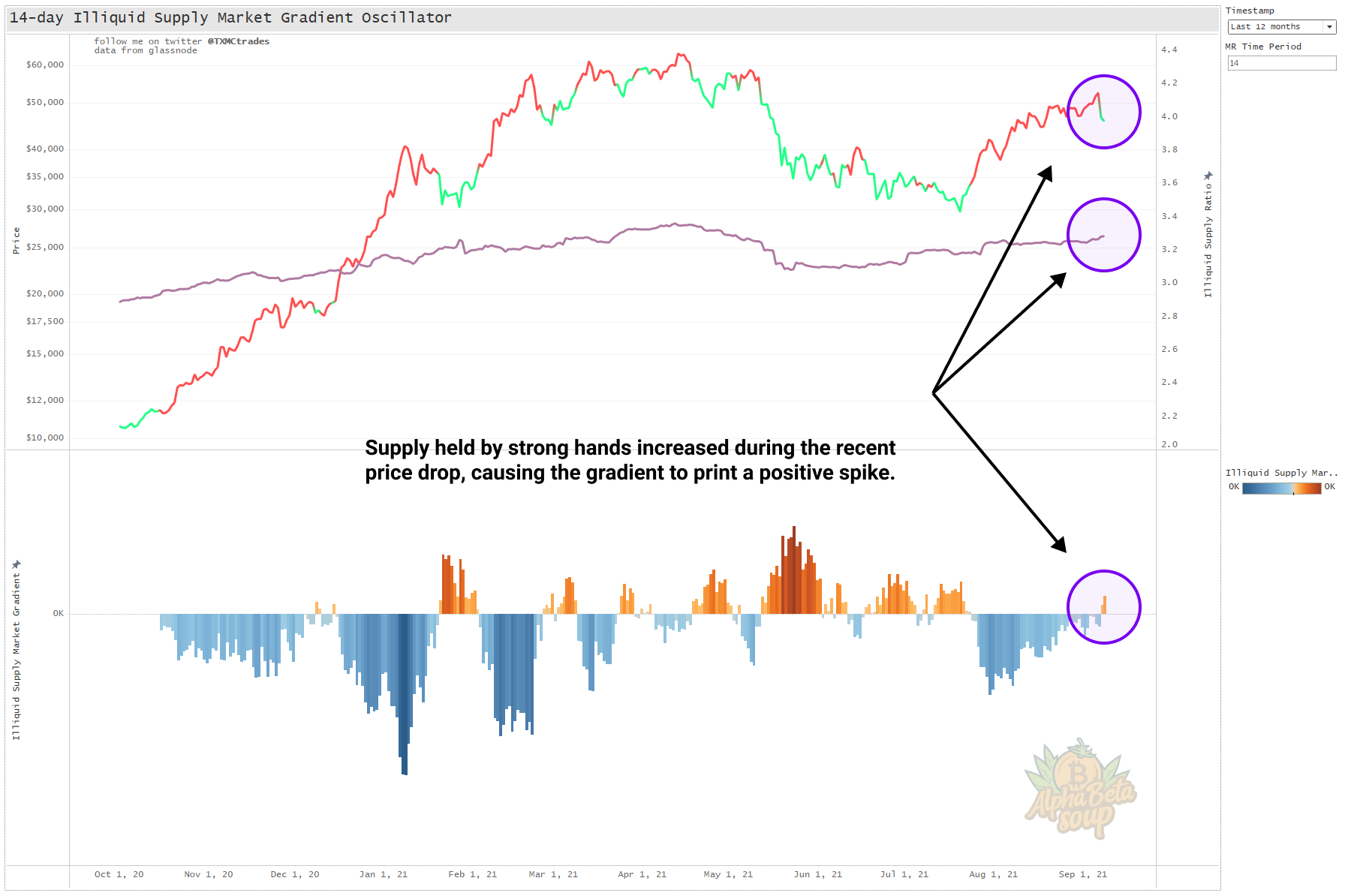 Willy Woo’s observations are confirmed by another on-chain analyst @TXMCtrades, who points to the 14-day Illiquid Supply Market Gradient indicator. It is used to estimate when long-term investors with strong hands are holding their positions more tightly than the price action indicates.