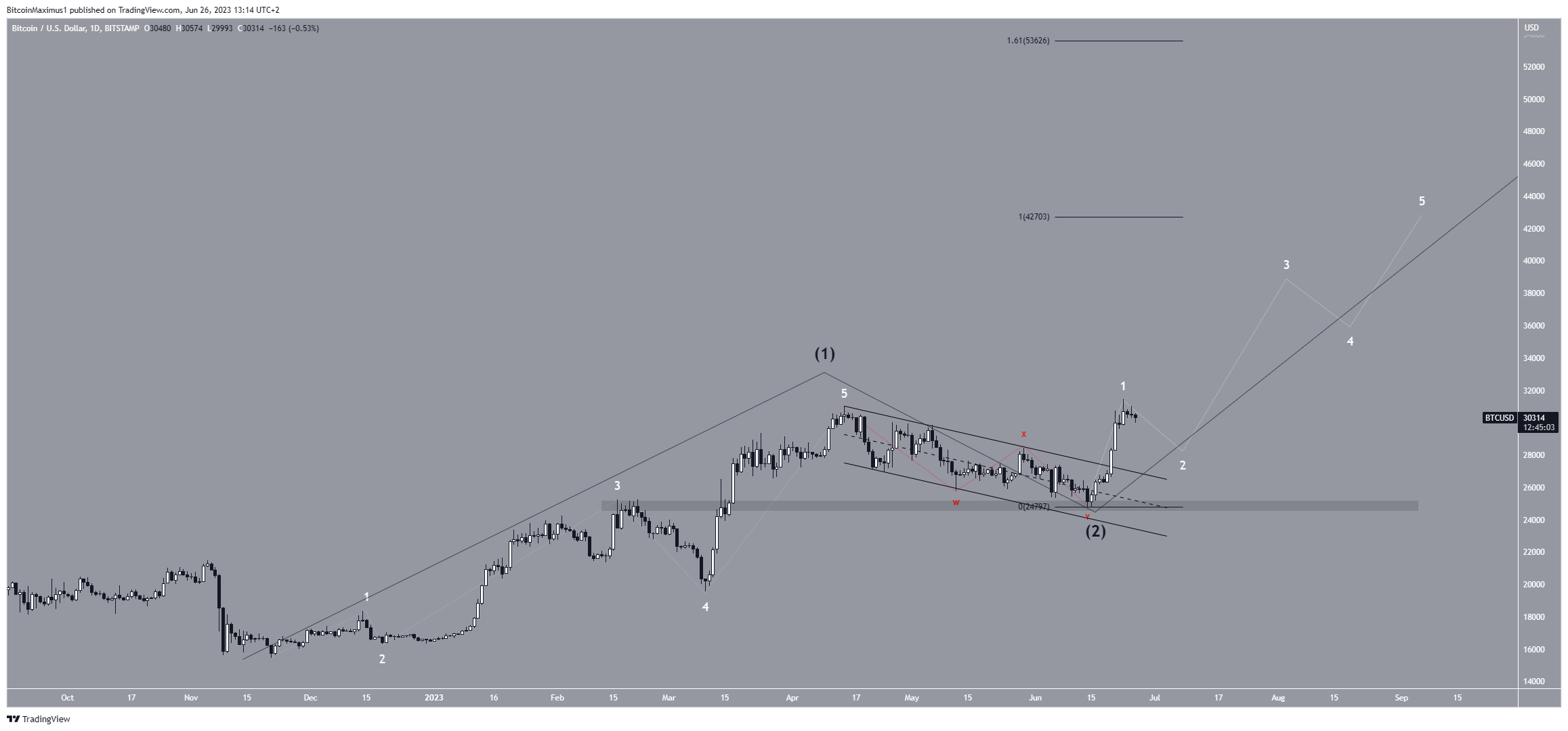 Despite this bullish long-term BTC price prediction, a movement below the wave two low of $24,800 (red line) will mean the trend is still bearish.