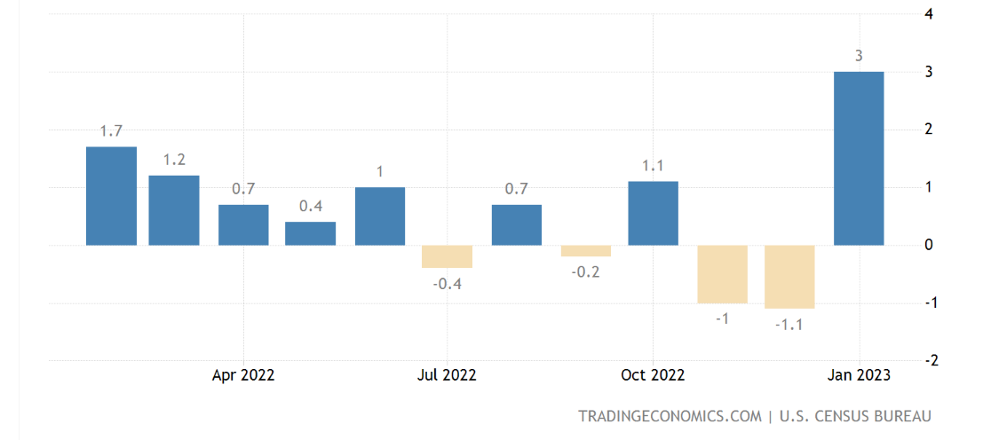 U.S. retail sales rose 3% in Jan. 2023 to $697 billion, beating analysts’ 2% estimates and exceeding December sales by 4.1% as healthy demand and CPI point to rising inflation.