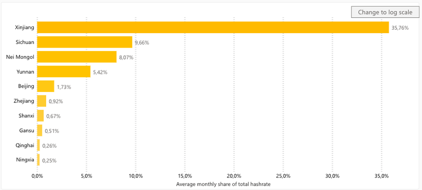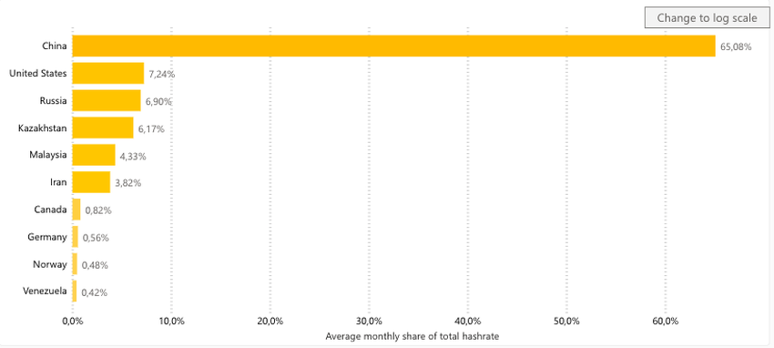 Overall, China has the biggest average monthly hash rate breakdown of more than 65%.