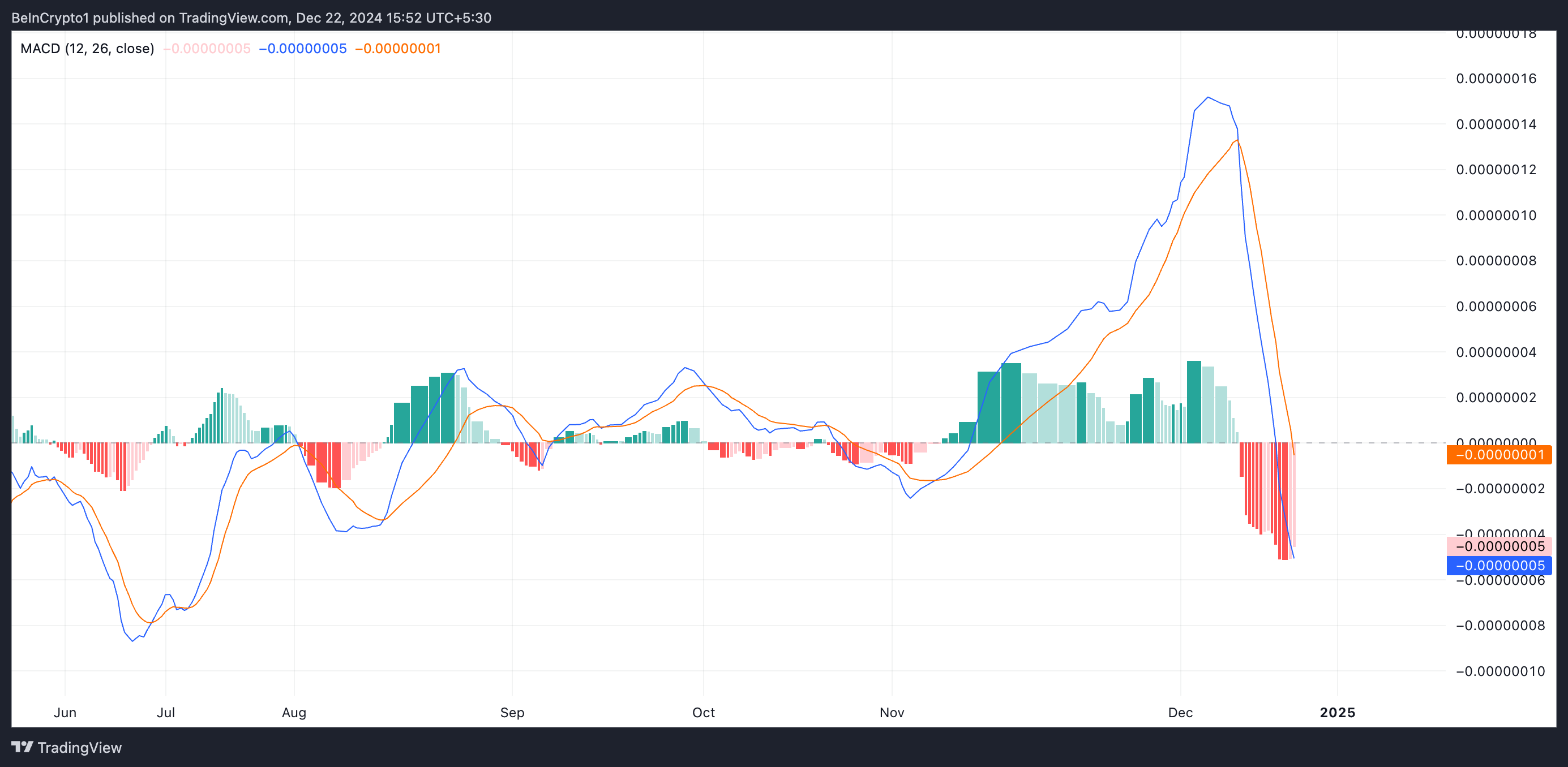 An asset’s MACD indicator identifies trends and momentum in its price movement. It helps traders spot potential buy or sell signals through crossovers between the MACD and signal lines. As in BTT’s case, when the MACD line is below the signal line, it indicates a bullish bearish, suggesting that the asset’s price may drop. Traders often see this crossover as a potential sell signal.