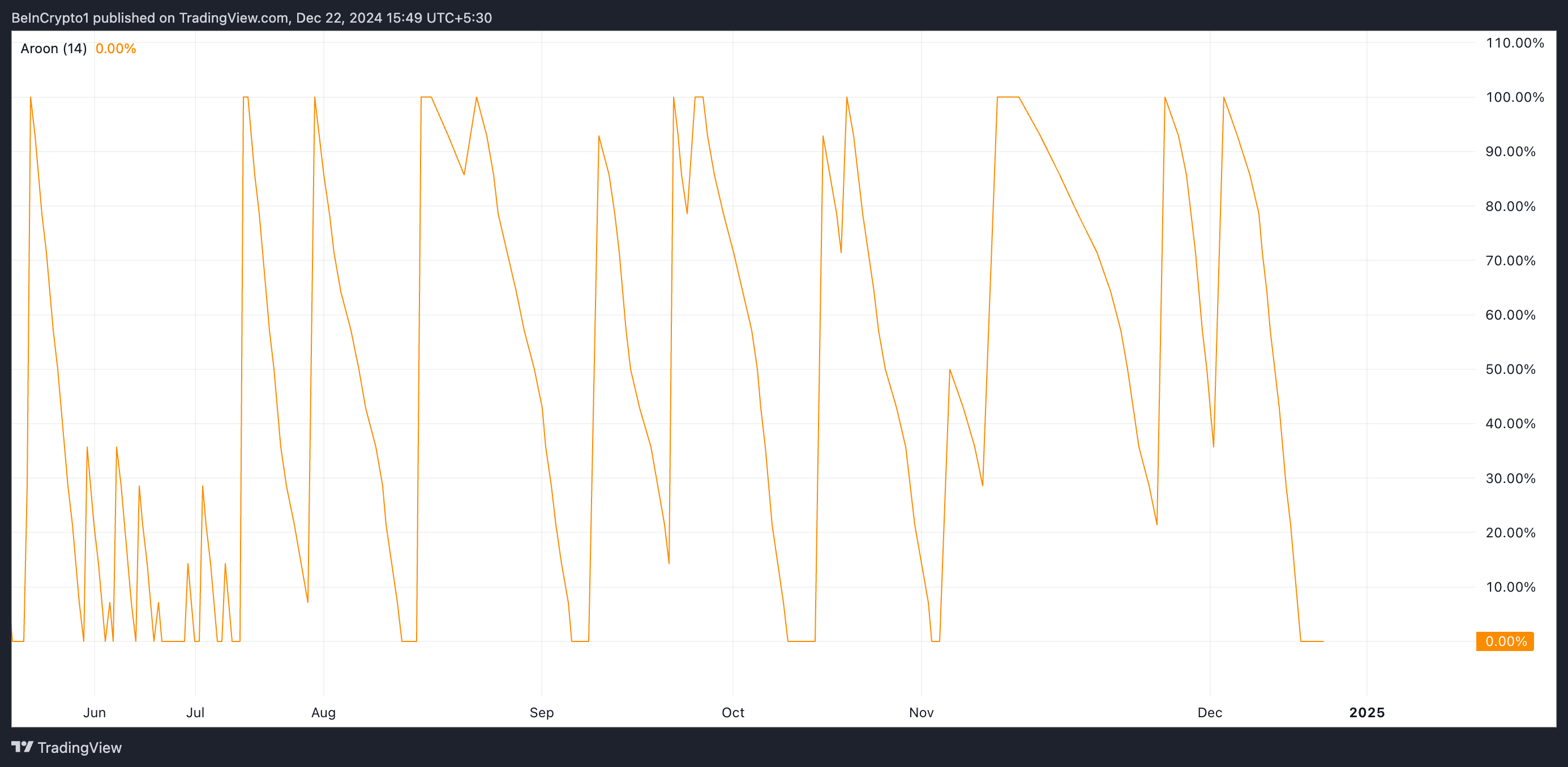 When an asset’s price rallies while the Aroon Up Line is at 0%, it indicates that while the price is trending higher, there has not been strong bullish momentum in recent times. The Aroon Up indicator measures how recently an asset has made a new high within a certain time frame. A value of 0% shows that the asset’s price has not reached a new high in the specified period.