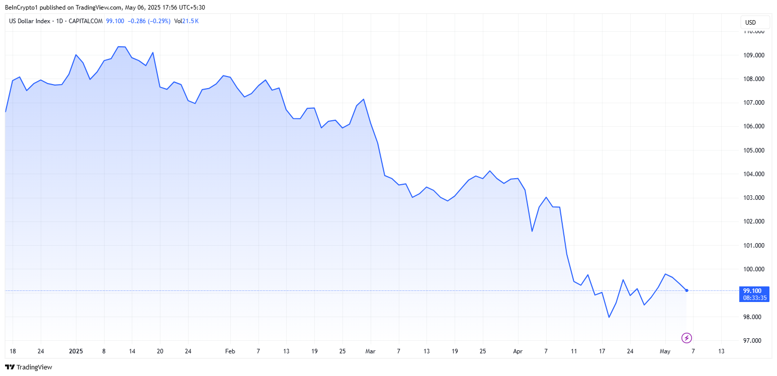 The chart shows the US Dollar Index (DXY) trend from 2025, reflecting fluctuations in the value of the US dollar against a basket of major currencies. It indicates a downward movement from February to May, with a recent slight recovery.