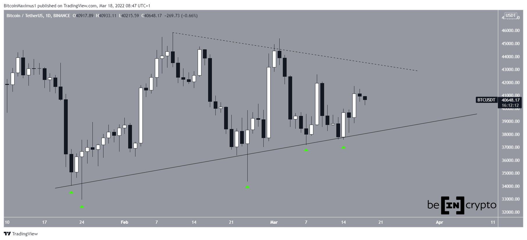 Bitcoin has been trading above an ascending support line since Jan. 22. It rebounded from the support on March 14 (green icon) and created a bullish engulfing candlestick. The price has been moving upwards at a more accelerated rate since, leading to a local high of $41,718 on March 16.Â