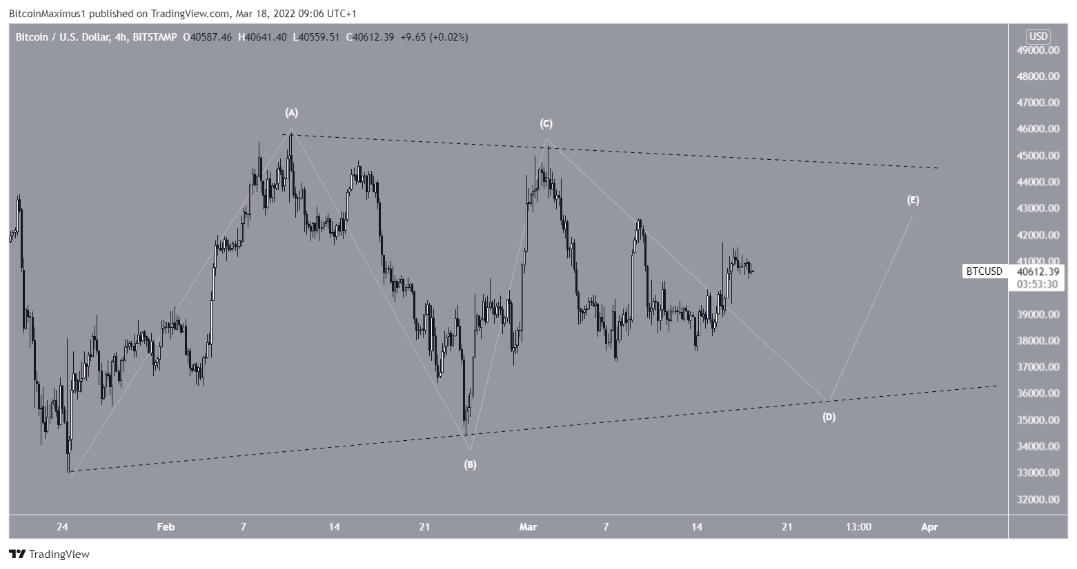 The bearish scenario still indicates that BTC is in trading inside a triangle pattern. However, since the triangle began on Jan. 22, the price would be likely to break to the downside after the pattern is complete.