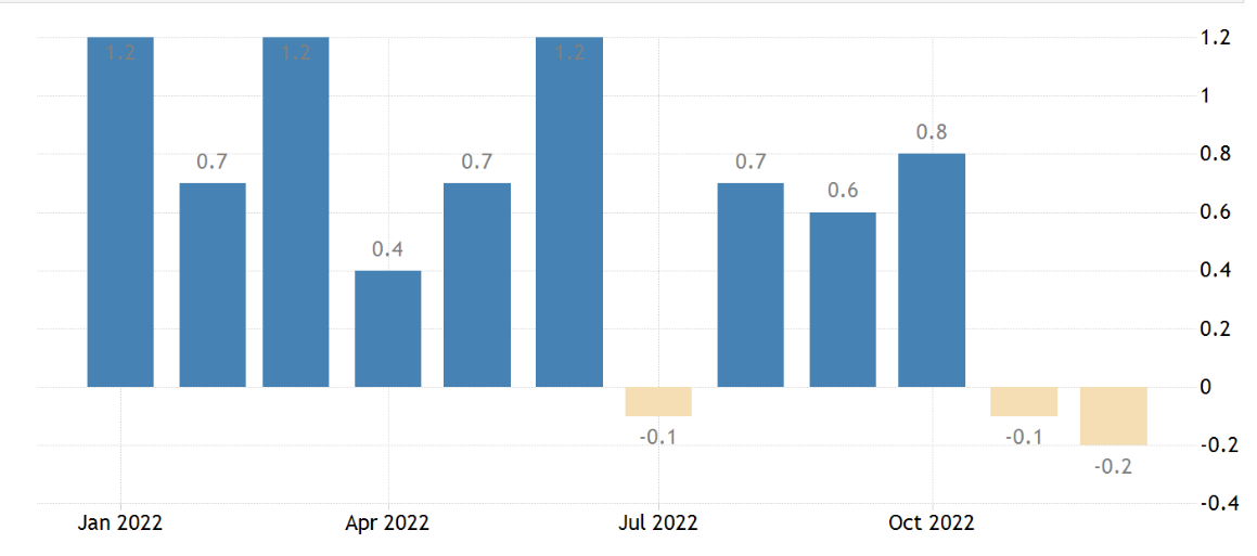 The U.S. Personal Consumption Expenditure (PCE), a measure of consumer spending, was down 0.2% month-on-month in Dec. 2022, falling below analysts’ expectations of 0.1%.