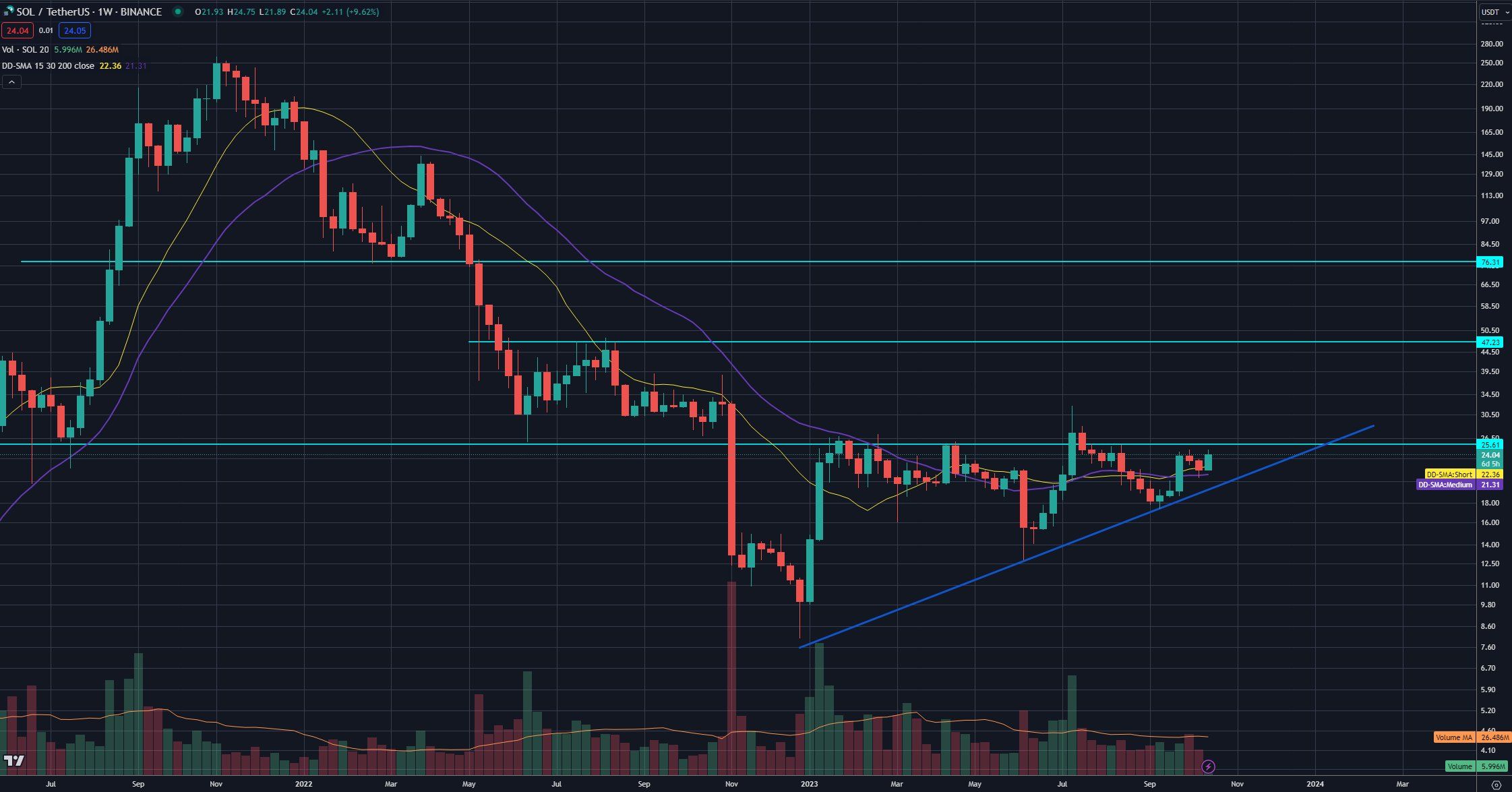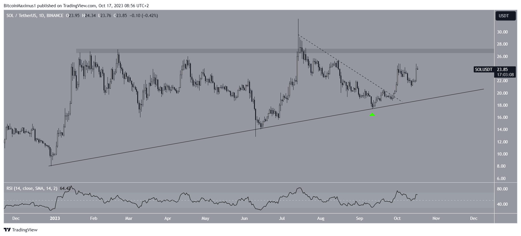 On September 28, the SOL price broke out from a descending resistance trendline (dashed), further accelerating its rate of increase. Despite the breakout, SOL still trades below the $27 resistance area.