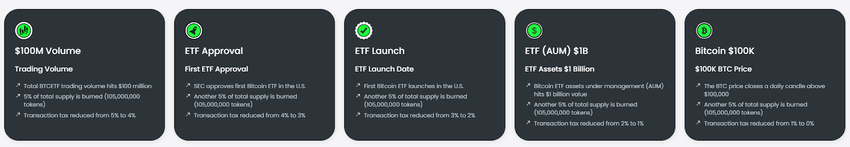 - Tokenomics include burning 25% of total supply based on 5 key Bitcoin ETF approval milestones.