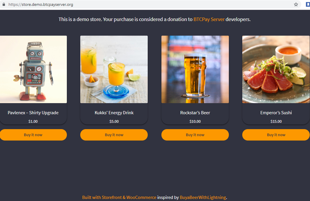 Also, present on the site is a demo for a point-of-sales interface. Because this is a demo site, no actual purchases can be made, however. Instead, all “purchases” are concerned donations to keep the BTCPay Service available for open-source usage.