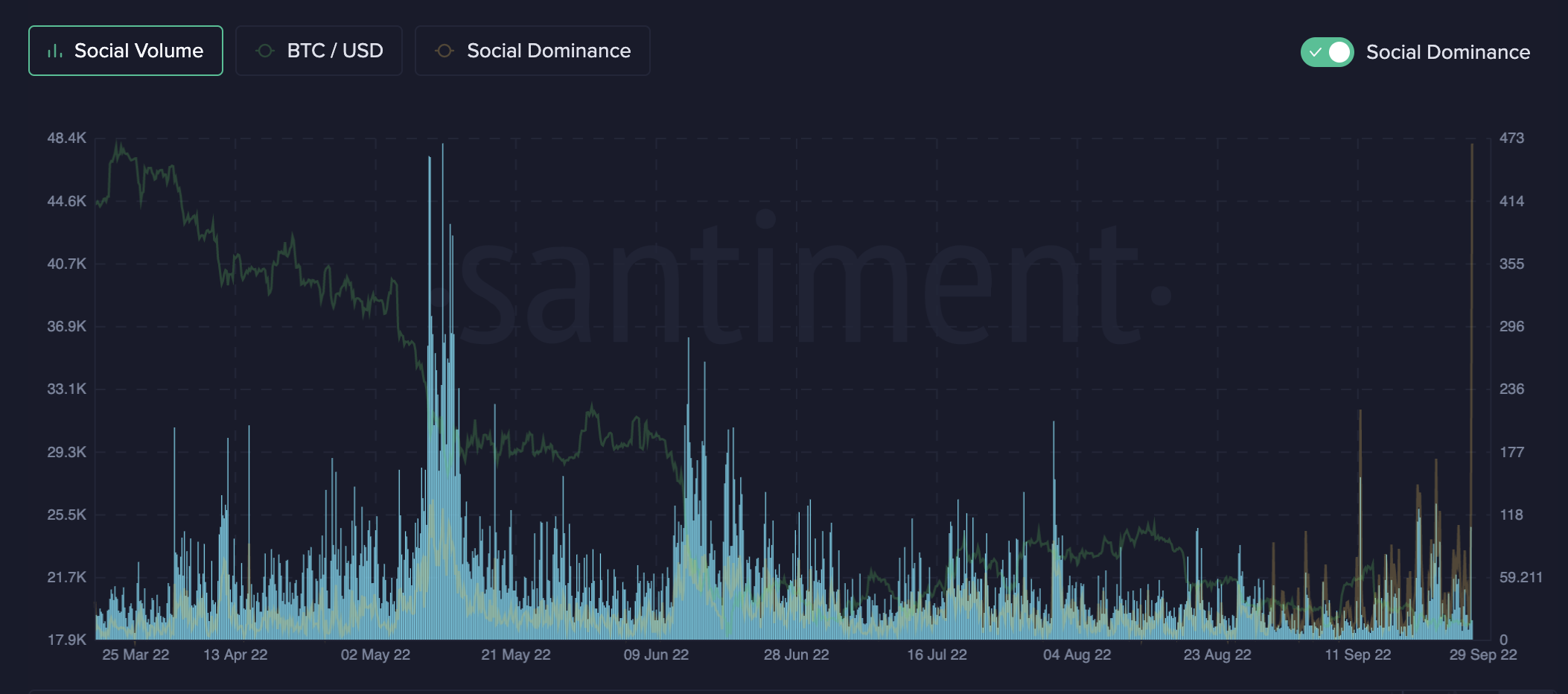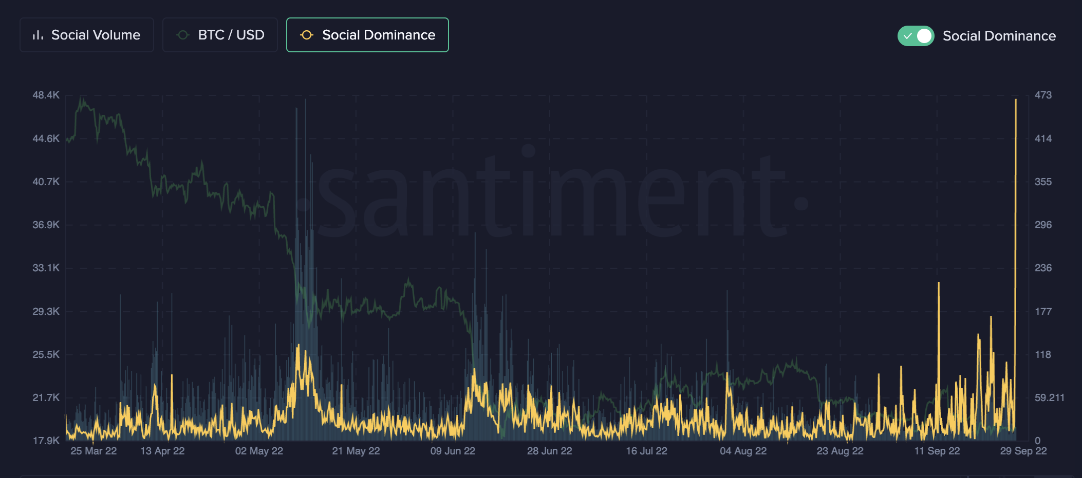 Notably, BTC/USD social volumes declined while social dominance saw a major uptick.