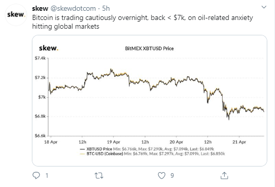 While the price has rebounded since, opening at $20 the next day, the 99.99% daily decrease cannot be ignored and could have an effect on the market at large. Well-known trader @Skewdotcom outlined a chart showing that the Bitcoin price has fallen back below $7,000, after trading above this level for several days. He suggests that this decrease was caused by oil-related anxiety, due to the aforementioned rapid crash in the oil price.Â