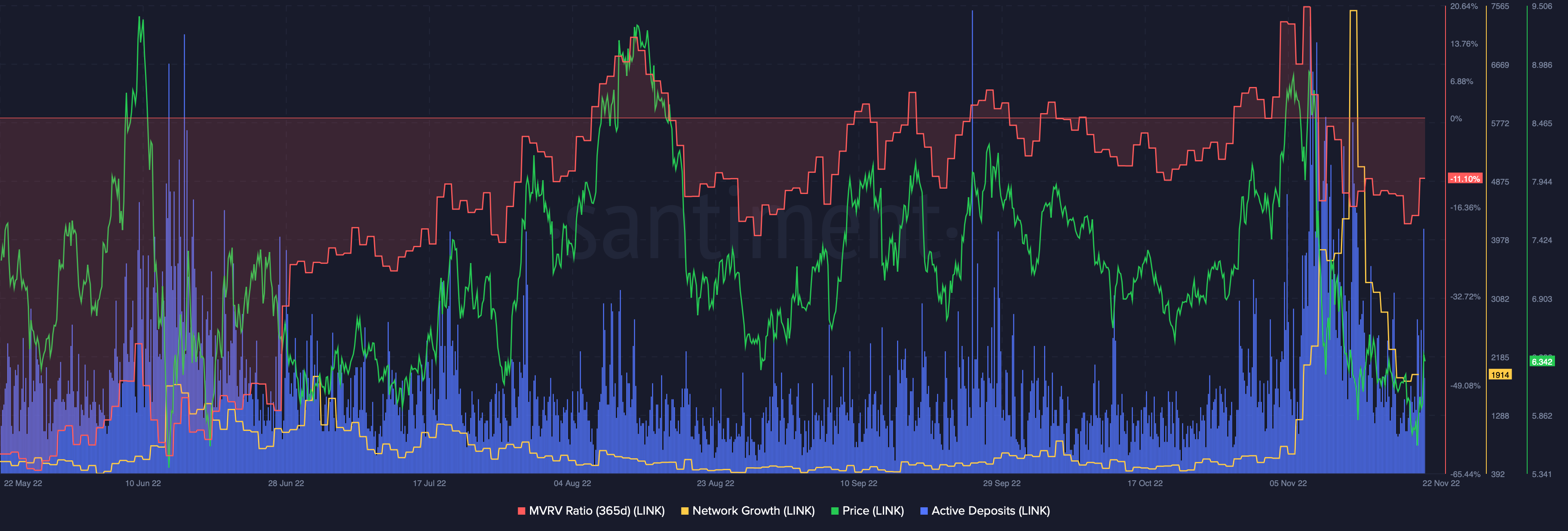 Another bearish trend plaguing LINK was its drop in network growth. Meanwhile, even though MVRV 365 days saw a bump, it was still trading in the negative territory, as seen above.
