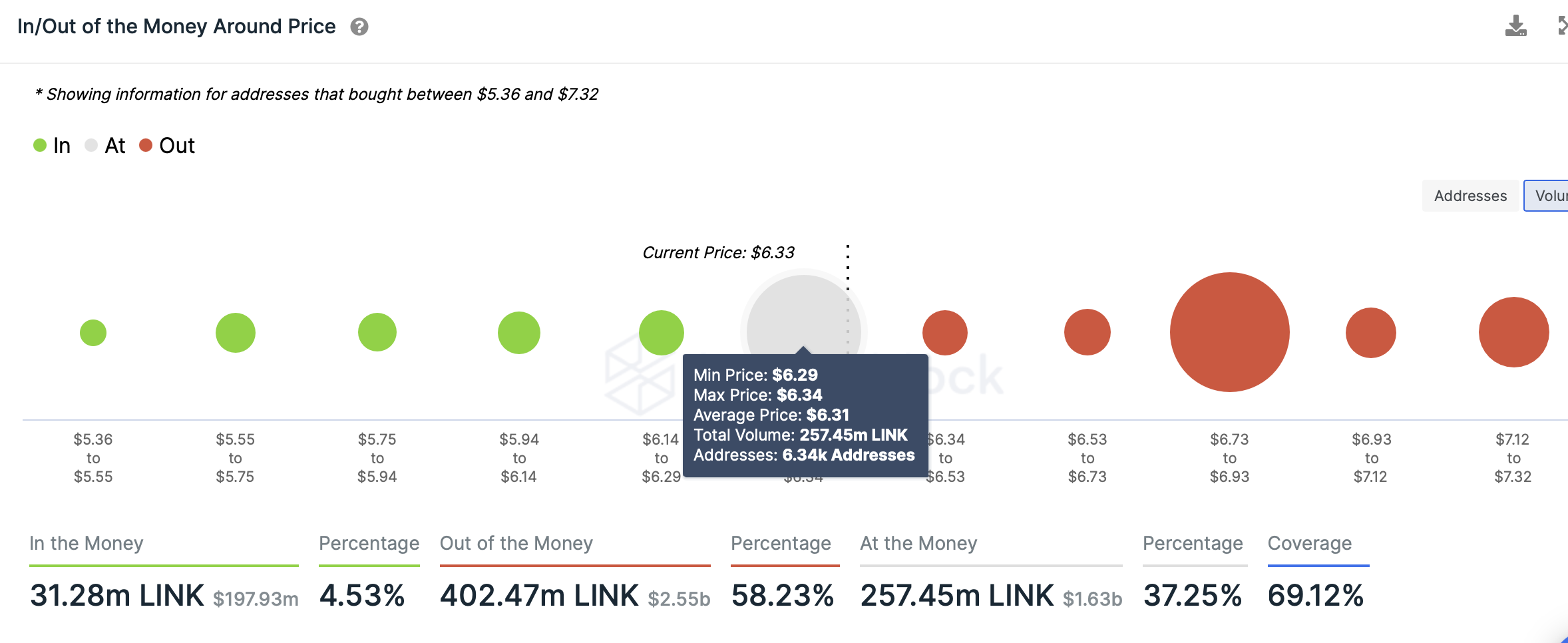 Going forward, for LINK bulls, it would be crucial to maintain the price above the $6.31 mark according to In/Out of Money Around Price Indicator.