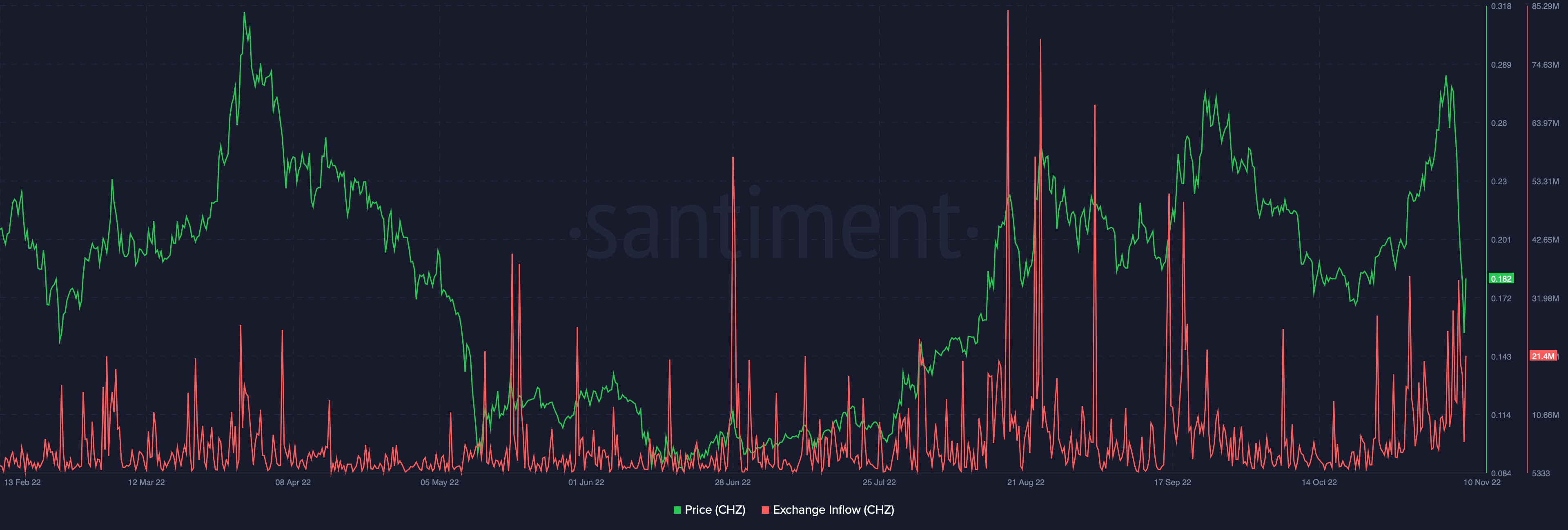 A major spike in Exchange Inflows took CHZ inflows above $21 million, which was further indicative of investors and traders moving tokens to exchanges as panic selling ensued.