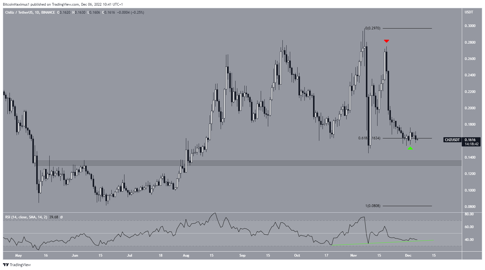 The Chiliz price is now trading at the 0.618 Fib retracement support level at $0.163. This is a crucial level since it is the final support area prior to $0.133.