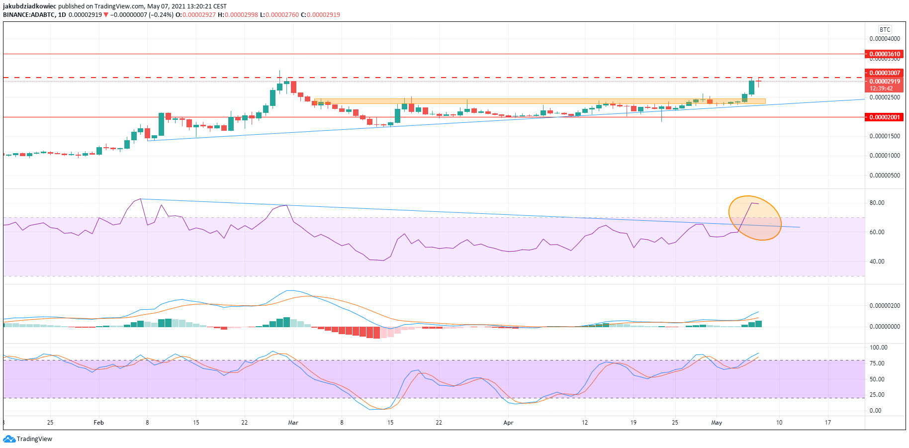 The price action of the ADA/BTC pair is interesting as we see a breakout from the smaller resistance area around 2400 satoshi (orange rectangle). Still, Cardano has to break the resistance of the previous peak at 3000 satoshi in which it is currently trading (red dashed line).