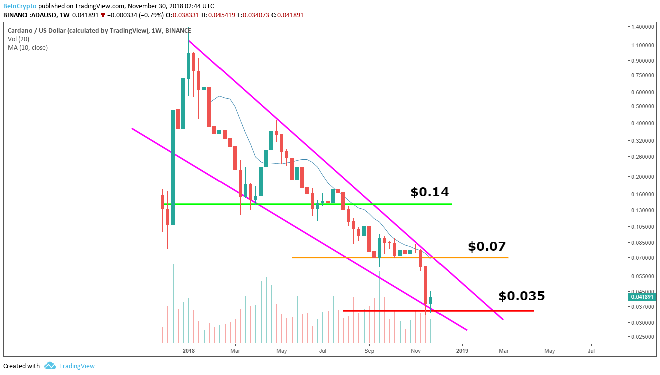 Cardano has fallen back from its all-time high at the beginning of 2018 within a descending channel, establishing horizontal supports on the way down.