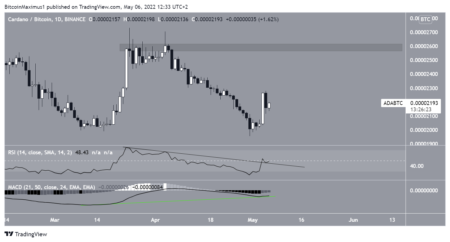 The ADA/BTC pair is more bullish than its USD counterpart. The main reason for this is that the same double bottom in the daily time frame has been combined with a bullish divergence in the MACD (green line).