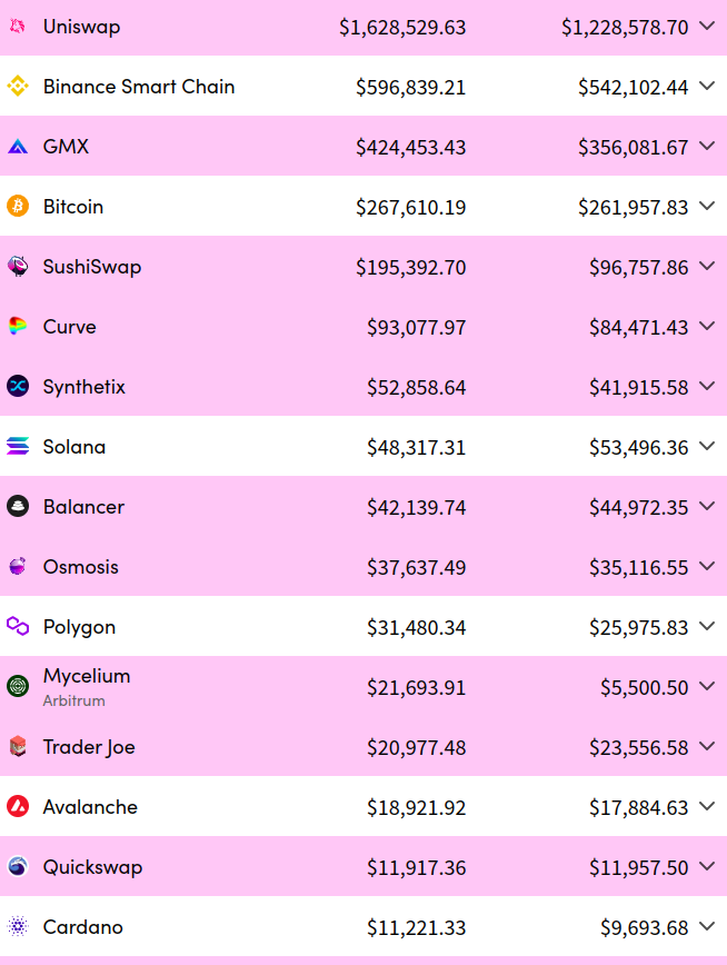 This low transaction count comes as a shocker when looking at Uniswap’s market cap of around $6 billion vs Cardano’s at $20 billion. Notably, Uniswap also has a higher $1,000,000 in daily fees count compared to Cardano’s $10,000 or lower in daily fees.