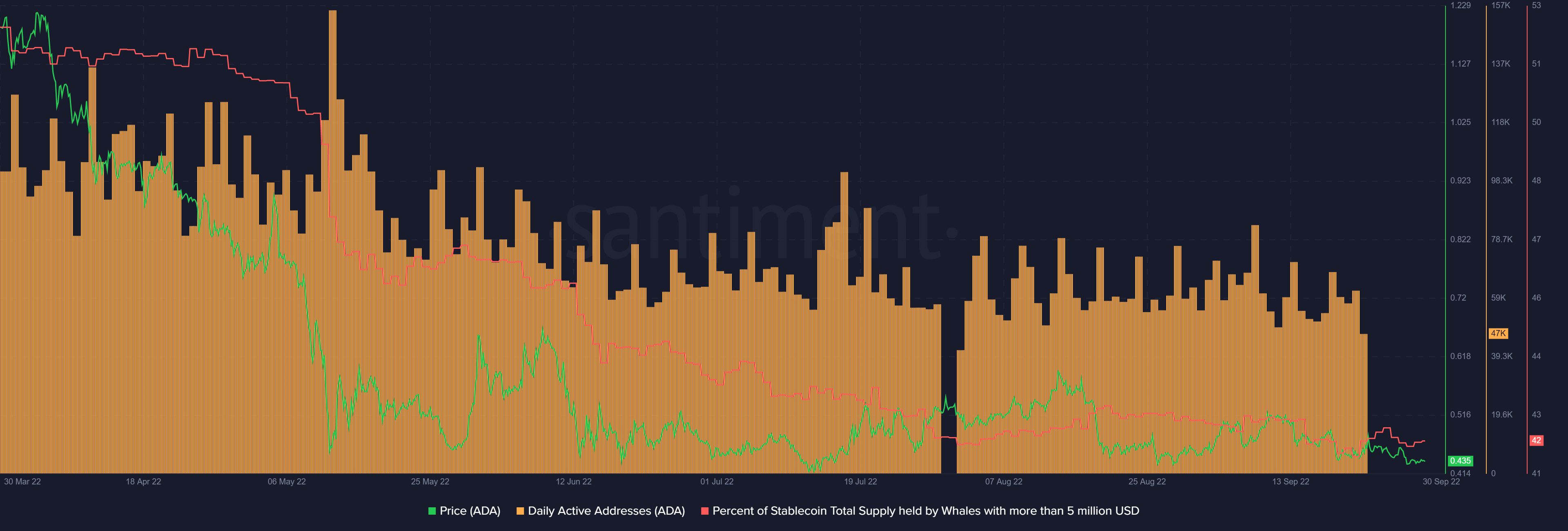 However, with the percentage of stablecoin total supply held by whales with more than $5 million at the lowest, it was evident that ADA whales were noting lower confidence. ADA whales have been noting a continued decline.