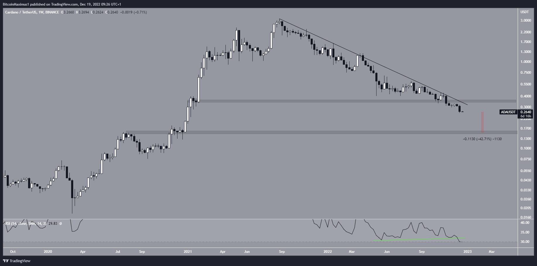 The Cardano price decreased underneath a descending resistance line since reaching an all-time high of $3.101 in Aug. 2021. The downward movement led to a low of $0.255 in Dec. 2022. Additionally, it caused a breakdown from the $0.350 horizontal support area. The area is now expected to provide resistance.