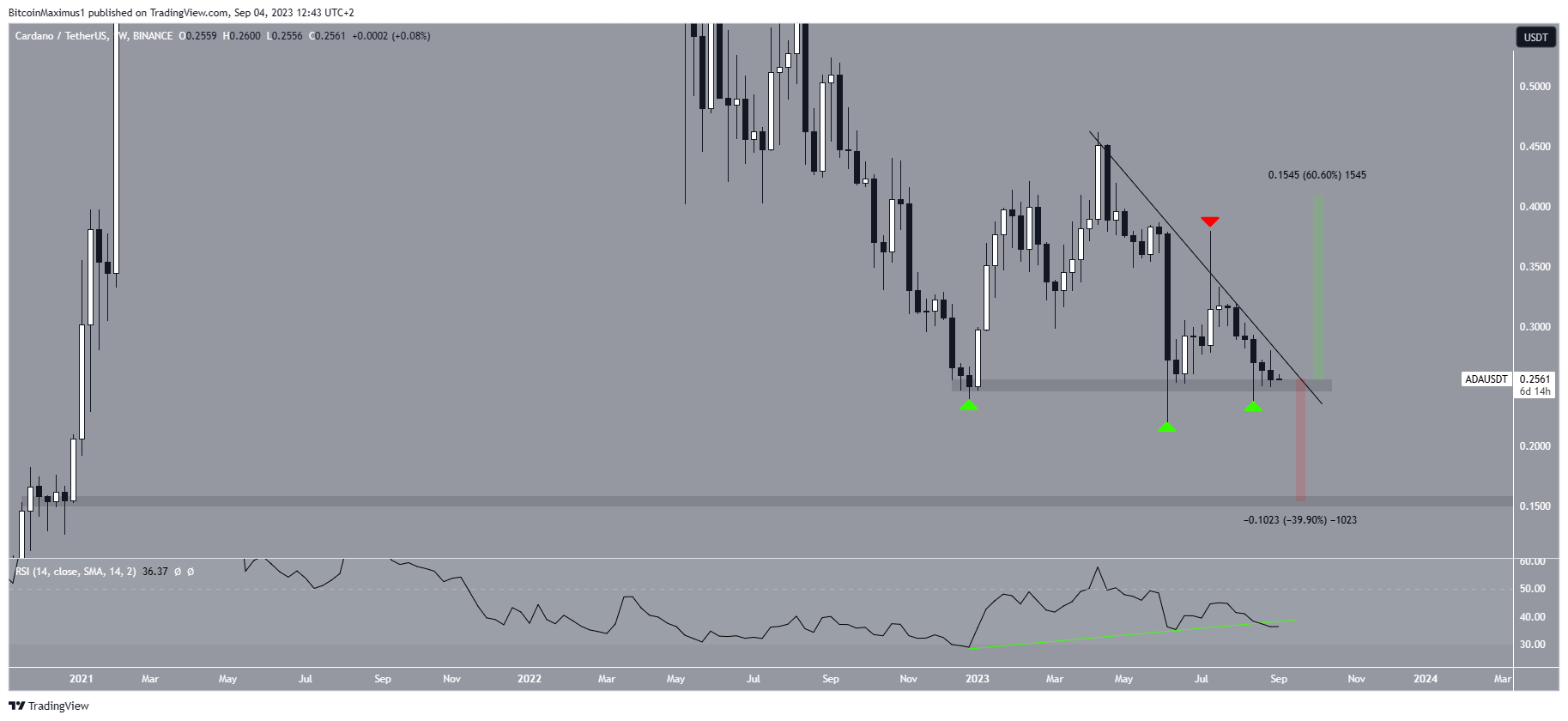 The technical analysis from the weekly timeframe shows that ADA is hovering just above the $0.25 horizontal support area. This is an important support area that has been in place since the start of the year.