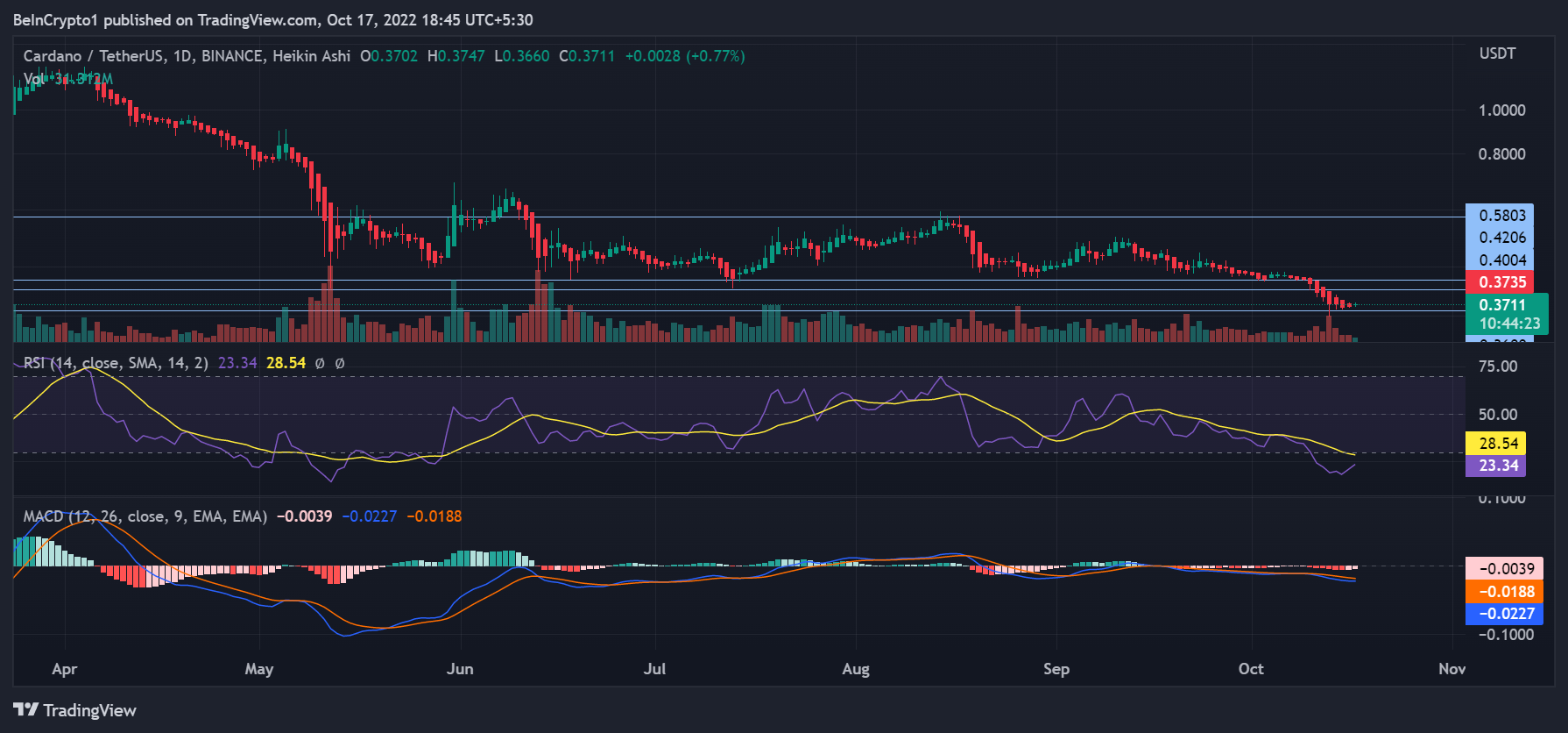 At the time of writing, ADA was trading at $0.37, noting minor daily gains largely due to the macro bullish momentum. MACD presented no reversal signs as daily RSI flashed oversold signals.