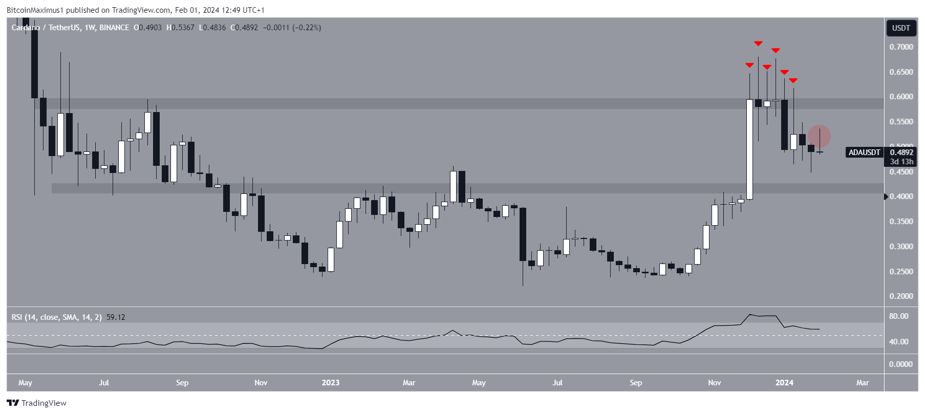The price action shows that ADA has decreased under a descending resistance trend line since December 14, 2023. More recently, the trend line rejected the price on January 30 (red icon).