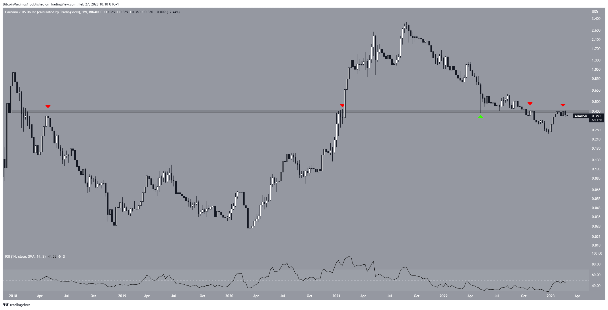 SponsoredThe price has increased since it failed to move above the long-term resistance area at an average price of $0.400. This is a crucial horizontal level since it has intermittently acted as both resistance and support since 2018 (red and green icons).