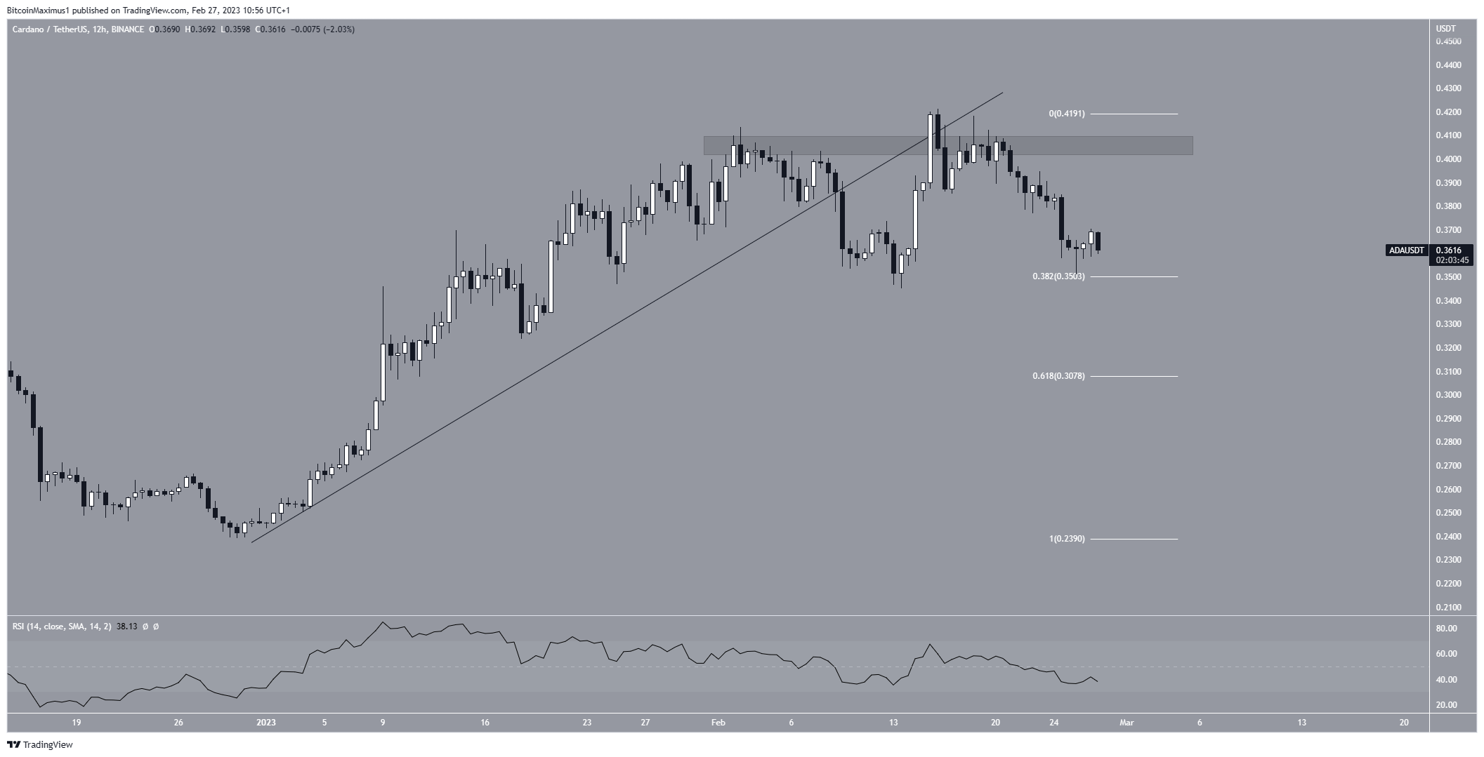 Currently, the price is trading above the $0.35 horizontal and Fib support level. If it breaks down, the ADA price could fall to the 0.618 Fib level at $0.307.