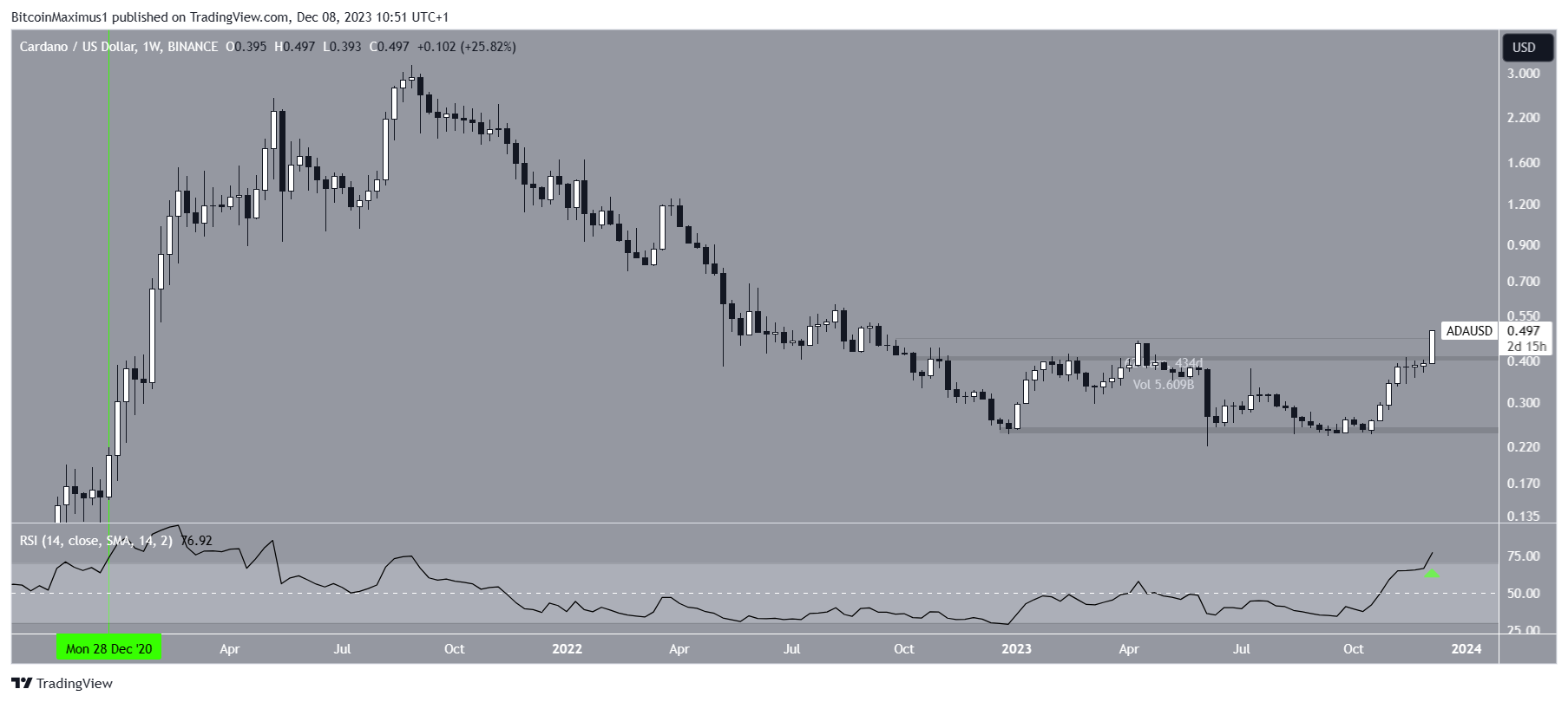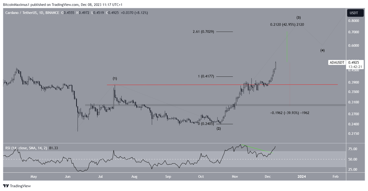 The upward movement culminated with a high of $0.50 today. This is a new yearly high and the highest ADA price since September 2022.