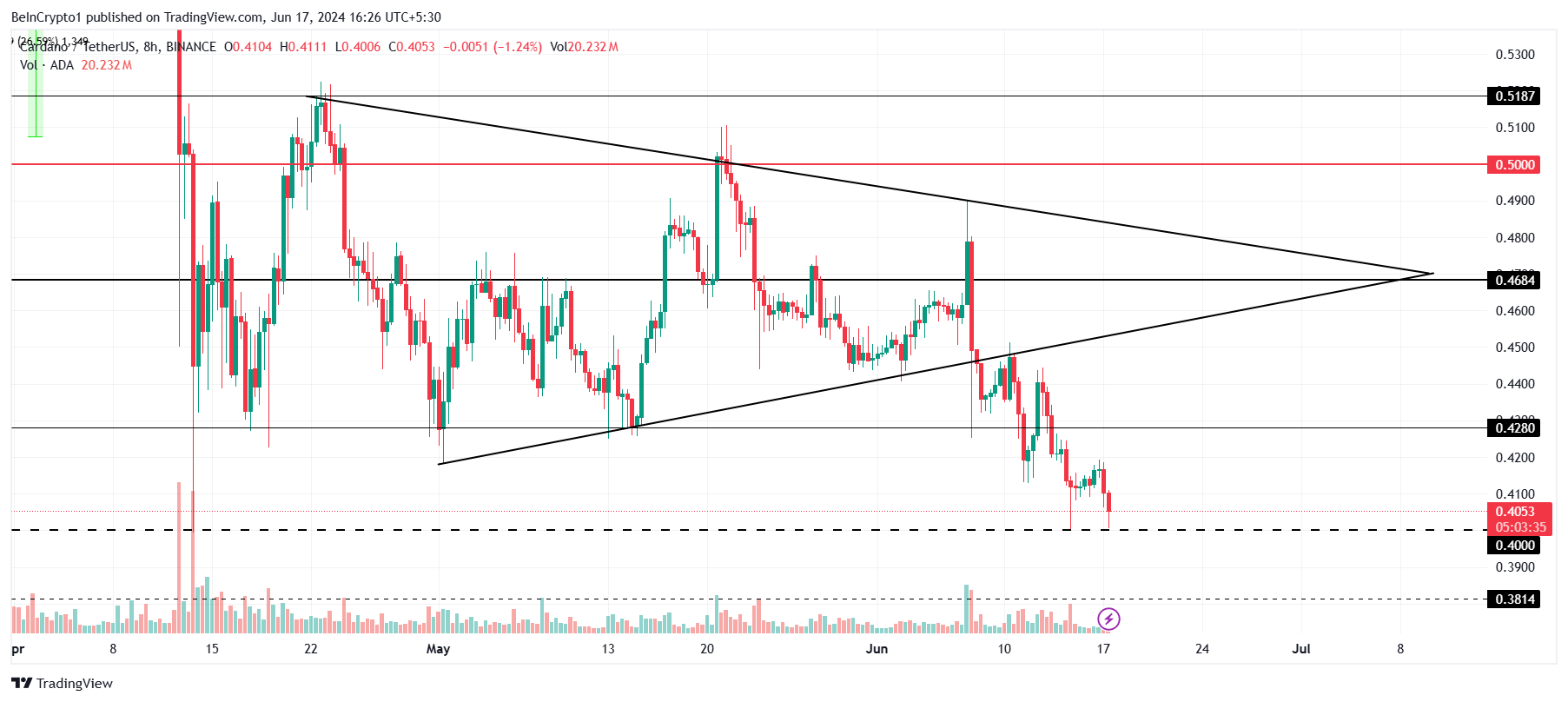 Cardano’s price recently faced a significant setback as it failed to break out of the symmetrical triangle pattern. Instead, it broke down and dropped to $0.40, indicating a bearish turn for the cryptocurrency.