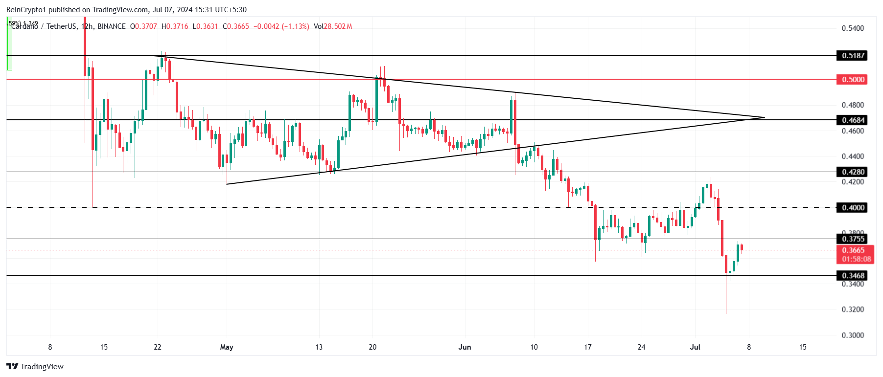 Cardano’s price bounced back from $0.34 despite nearly falling below the support line. Currently, ADA is trading at $0.36, close to breaching the resistance at $0.37. This level has been tested as support multiple times in the past.