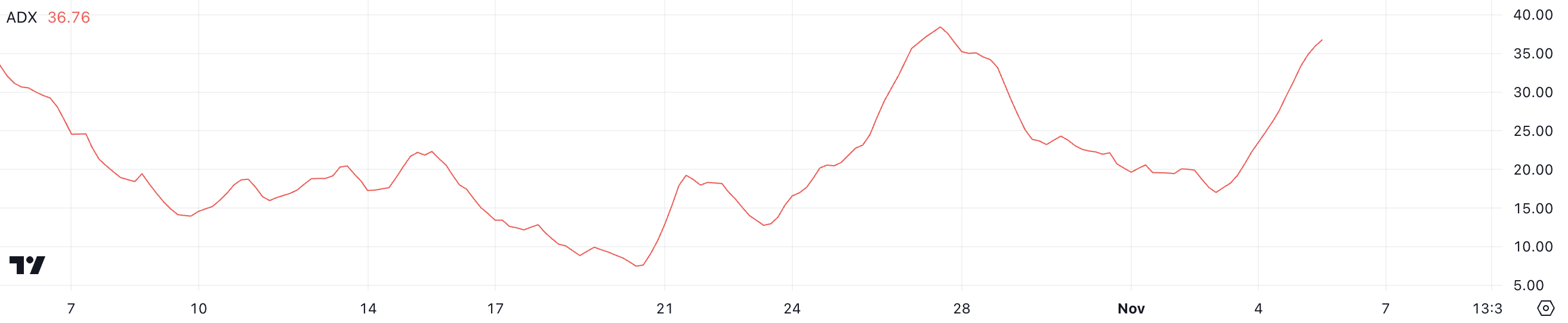 Cardano’s (ADA) ADX has climbed to 36.76, a significant rise from around 17 just days ago. This increase signals that the strength of ADA’s current trend has intensified.