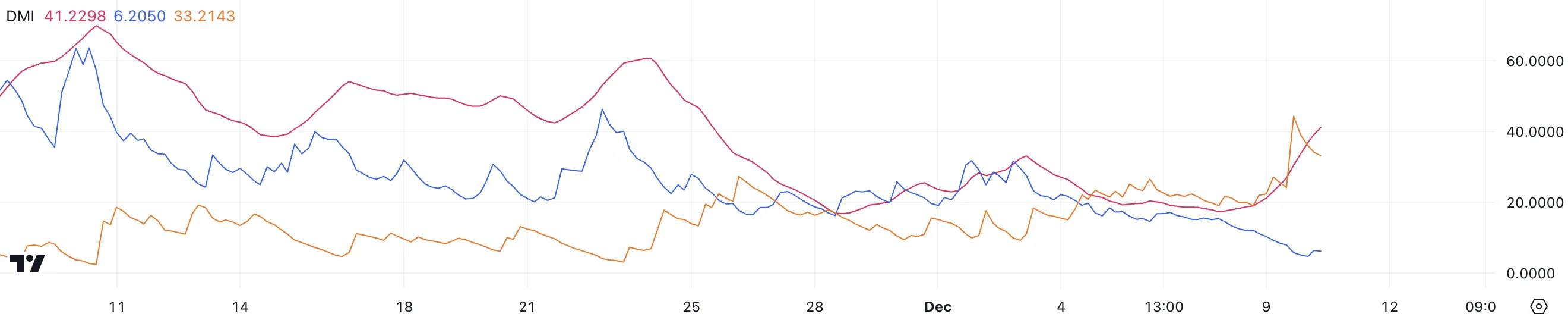 Cardano ADX has risen to 41.2, up from around 19 two days ago, indicating that the trend is gaining strength. Despite this, ADA remains in a downtrend, with its D- at 33.2 and D+ at 6.2.