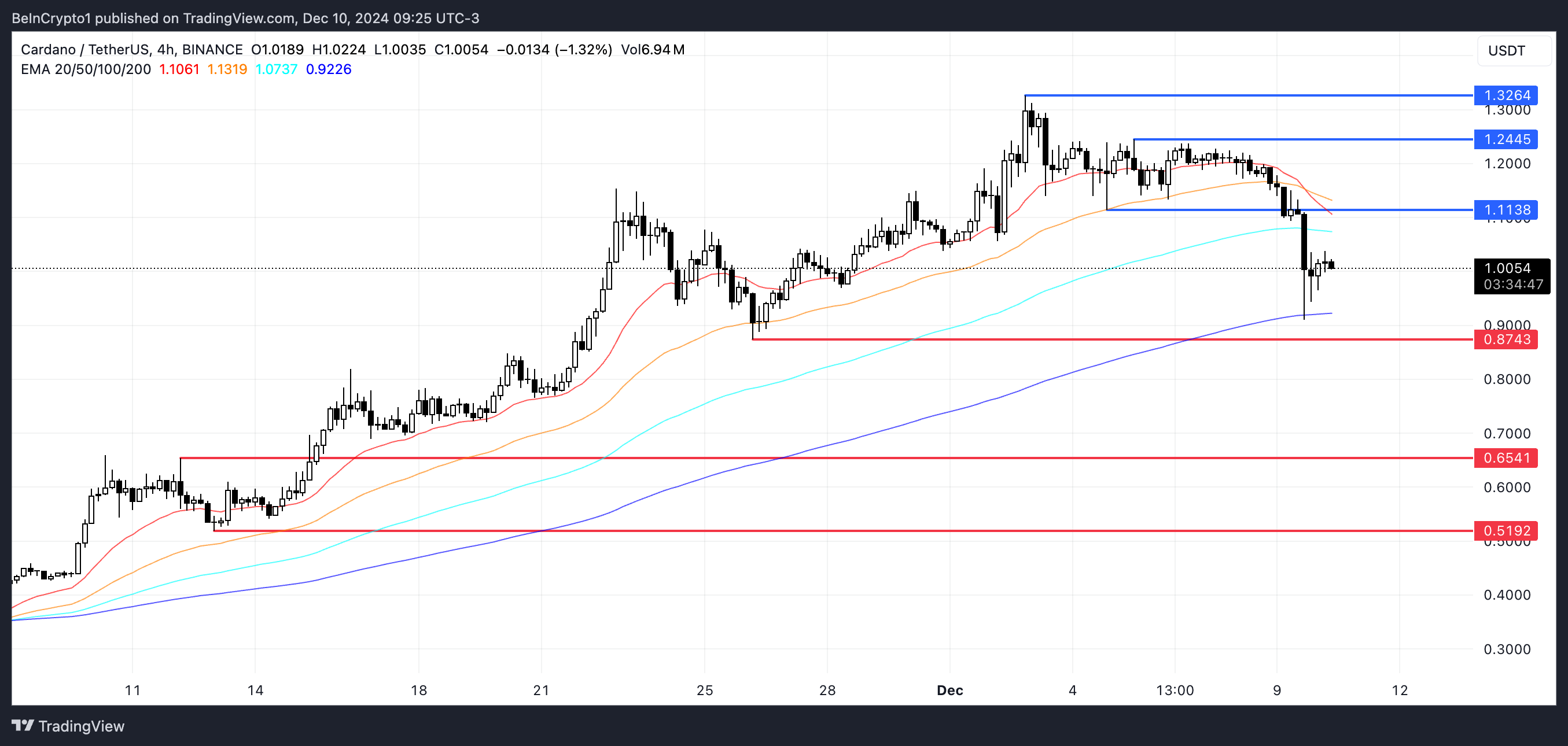 On the other hand, if ADA price manages to reverse the current bearish trend and regain positive momentum, it could challenge the resistance at $1.11.