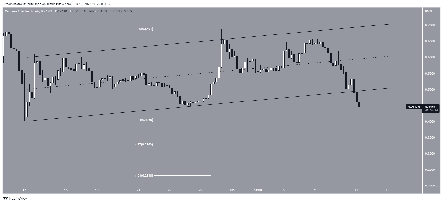 Finally, the six-hour chart shows that ADA has already broken down from an ascending parallel channel. This supports the possibility that the downward movement will continue.Â