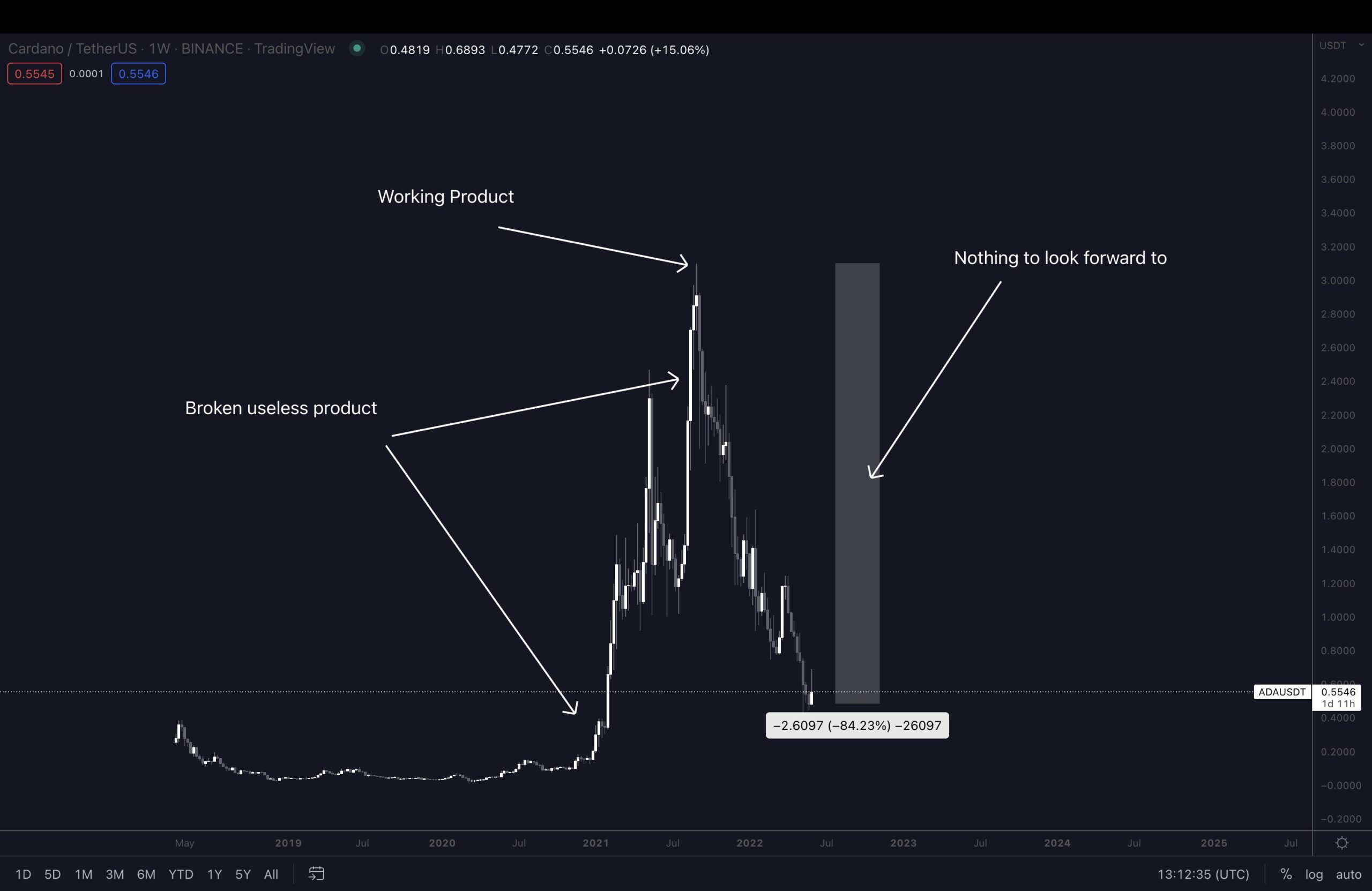 Cryptocurrency trader @Pentosh1 tweeted an ADA chart which shows a 85% drop since the all-time high. At the current price of $0.45, the price has decreased by exactly 85%.