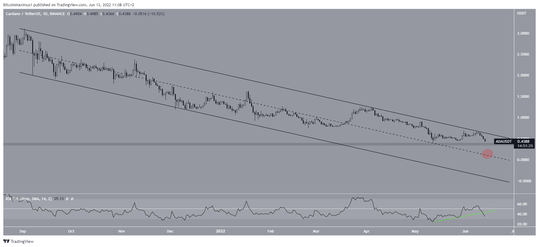 The daily chart shows that ADA has been decreasing inside a descending parallel channel since the aforementioned all-time high.Â