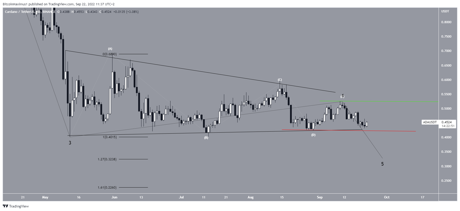 Since the May bottom, it seems that ADA is trading inside a symmetrical triangle, which could be wave four (black) of a five-wave downward movement. The sub-wave count is given in white.